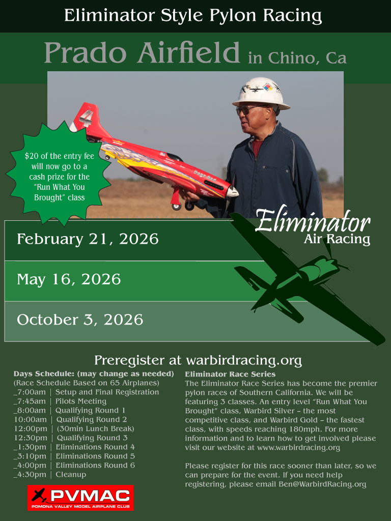 “Run What You Brought” class is design for any RC pilot with any aircraft to get started in air racing. The “Warbird” classes mirrors the Warbird (Silver Class and Gold Class) racing that is currently being run by our friends in the RCPRO racing series and the SAM (Sacramento) series.